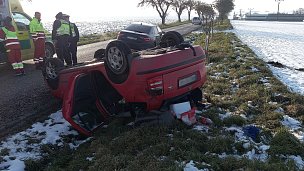 V příkopu na střeše skončilo osobní vozidlo po nehodě u Nedělišť. Jedna zraněná osoba byla záchranáři transportována do nemocnice k dalšímu ošetření. Hasiči odpojili akumulátor vozidla a po vyšetření nehody policisty převrátili vozidlo zpět na kola a vyprostili jej z příkopu.