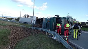 Kamion na boku komplikuje dopravu v Nádražní ulici v Opocně na Rychnovsku. Zraněnou osobu hasiči předali do péče ZZS.