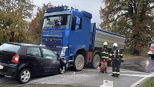 Ke střetu osobního a nákladního auta došlo na silnici II/325 u Velkého Vřešťova. Jedna osoba byla zraněna. Osobní vůz skončil po nárazu zaklíněný přední částí pod náklaďákem, posádku nebylo nutné vyprošťovat.