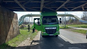 V ulici Akademika Bedrny v Hradci Králové zasahuje místní jednotka profesionálních hasičů z centrální stanice u ohlášené dopravní nehody nákladního automobilu, který se zasekl pod železničním mostem.